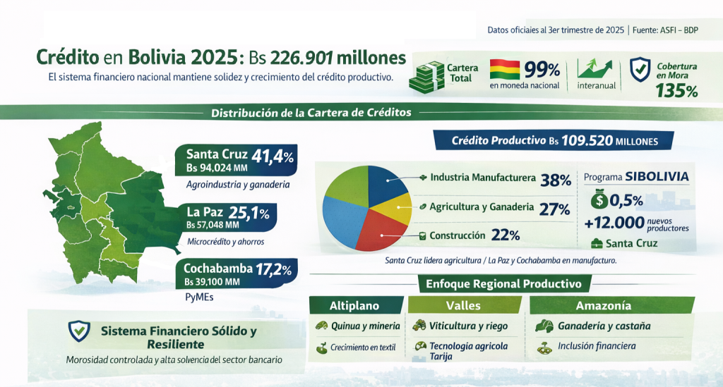 Según los datos provenientes de la Autoridad de Supervisión del Sistema Financiero (ASFI) y el Banco de Desarrollo Productivo (BDP) -el principal emisor de créditos agrícolas-, a diciembre de 2025. Santa Cruz concentra el primer lugar en la cartera productiva nacional, le sigue La Paz y Cochabamba, siendo el eje troncal el que aglutina la mayor participación a través de programas como SIBOLIVIA